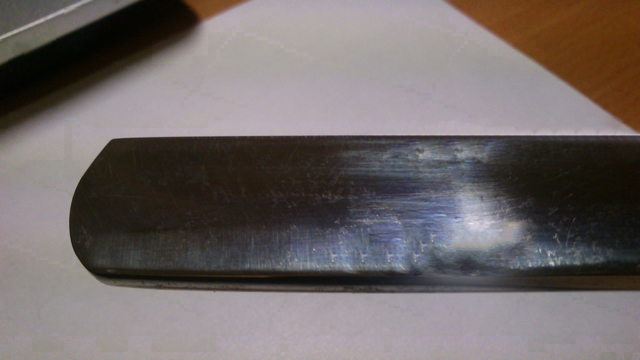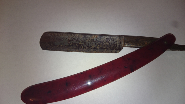 Вчера забрал бритву. Как и говорил связался с одним из форумчанинов из моего города. Ник ANATOL. Он и обещал посмотреть что можно сделать. Отдал ему бритву на заточку. Вот что получилось. Следы на месте коррозии остались, но режущая кромка целая. Спасибо Анатолию, восстановил как смог. Сказал что волос режет. Так что вечером сходил в душ чтобы распарить получше щетину и приступил к бритью.