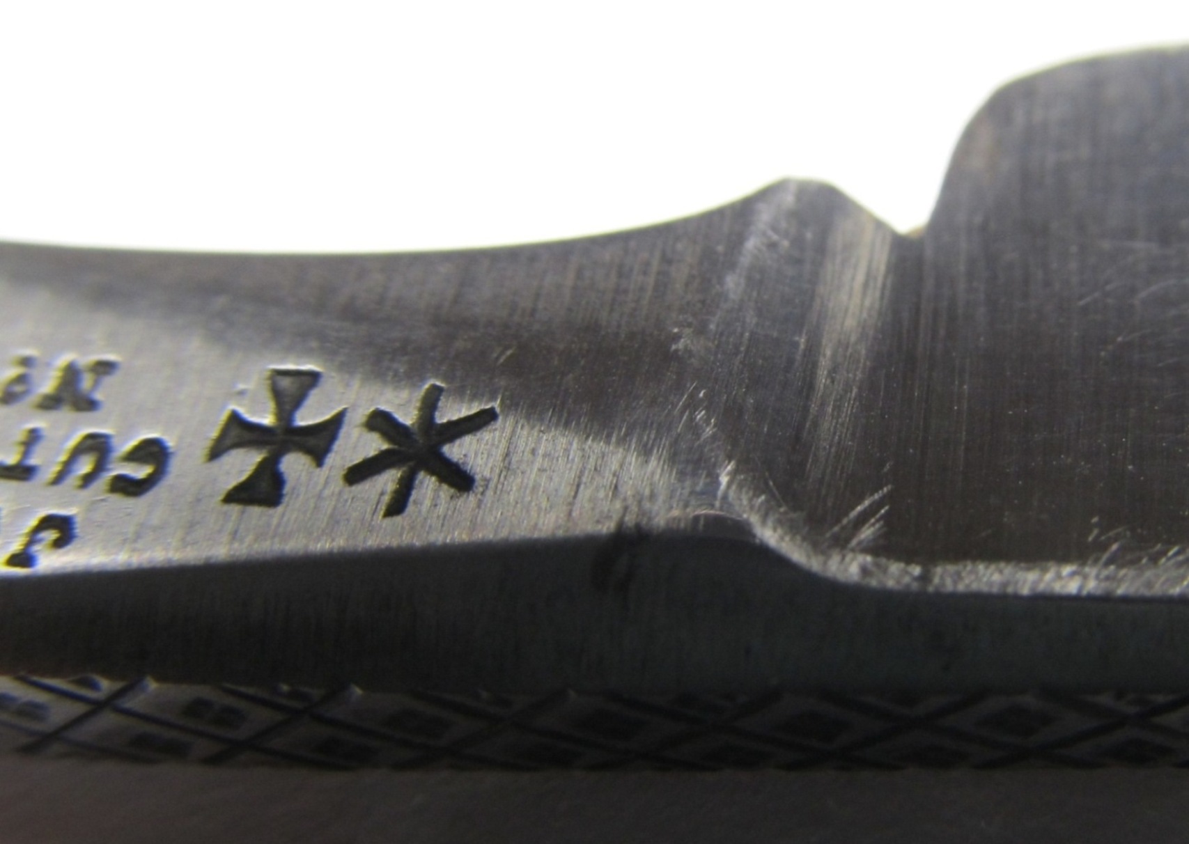 Обушок возле носка и пятки 4,2 мм, по центру 4,0 мм; ширина лезвия 15 и 14,5 мм, соответственно. Вмятины на РК от неосторожного закрытия бритвы (вдавили в рукоять). Рукоять слоновая кость. Про клиныщек пишут, что свинец, а пины из никелевого серебра (новое серебро), т.е мельхиор.