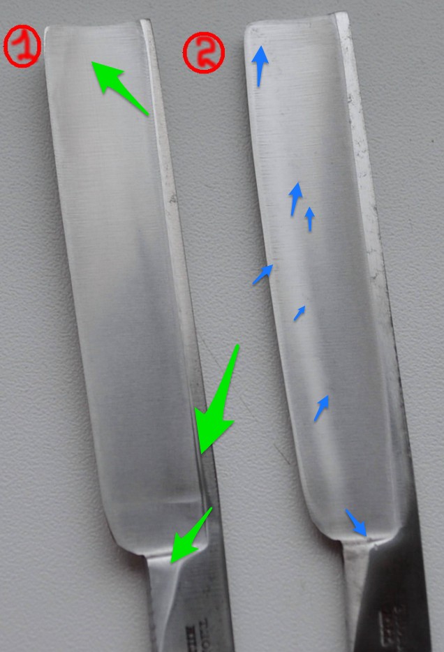 Добавлено спустя 15 минут 4 секунды: Ладно. Так будем гадать до утра. Вопрос был немного с подвохом. Начинать нужно с того что это очень старинные бритвы. Начало 19го примерно. Т.е. никакого гриндера в привычном понимании там не было тогда и в помине. Был камень. Круглый вращающийся и большой. На самом деле шлифованы два полотна. Оба шлифованы мною. Полотно №1 шлифовано абразивом в 400 и потом в 600грит Полотно №2-только в 600. Естественно убрать риски от фабричного камня сразу перескочив через два- три порядка по классу шероховатости(точности) поверхности не получится. Остается виден след фабрики. Камня. Поэтому оцениваю наиболее правильный ответ-как ответ anton. Он один сказал по глубине риски. Полотно под номером 2 ближе к фабричному. А вот так выглядят полотна прошедшие через столетия. После фабрики. До моей шлифовки. Там все мыски и носки и сточенные обухи.