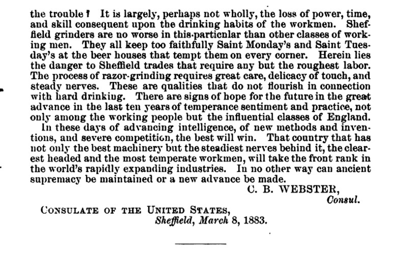 Эта потеря мощностей, времени и навыков в значительной степени следствие отношения к спиртному рабочих. В принципе, в этом шеффилдские шлифовальщики не лучше других рабочих. Они слишком «добросовестно» относятся к традиционным прогулам в святой понедельник и вторник из-за пивных, которые искушают на каждом углу. ( проблема продолжения пьянства после выходных описана в википедии https://en.wikipedia.org/wiki/Saint_Monday" onclick="window.open(this.href);return false; . С песней из Шеффилда на эту тему: «веселый катлер». Катлер – рабочий, производящий столовые приборы. Примечание моё). В этом и заключается опасность для сделок, которые требуют что-то выше, чем просто грубый труд. Процесс шлифовки бритв требует большей осторожности, деликатности прикосновения и устойчивых нервов. Эти качества теряются вместе с процветанием пьянства.»