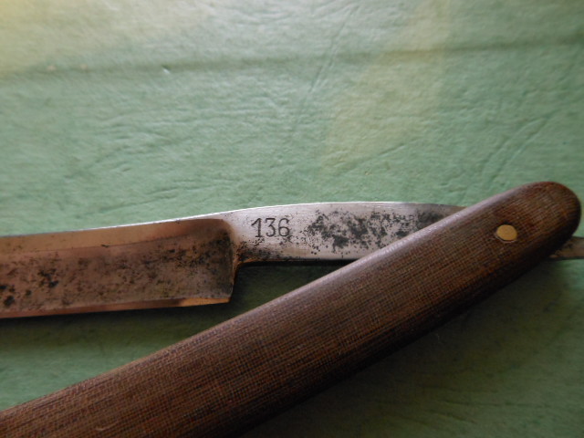 вот тут, надысь, пришлось ехать из Рязани в Смоленск с напарником в качестве пассажира, а накануне принесли мне бритву -- ну как бритву -- кусок ржавчины с текстолитовой ручкой. что бы было не скучно, взял я ее с собой, ну и наждачки набор)))). В общем 4 часа мне было чем заняться, а потом я загрустил, т. к коррозия страшная. После наждачки пропала травленая на клинке надпись, которая почти не читалась. Приехав, переклепал ручку и поточив -- отложил. Кстати пин стальной родной, а шайба медный сплав. А вчера дошли руки, прошелся по ремню с ГОИ , потом по гладкому и побрился.... Как говорится звезда была в шоке.... бритва бреет супер. ВОТ ТОЛЬКО ЧТО ЗА БРИТВА? клейма почти не видно, но что то вроде кабана. ну и цифры 136 что они значат?