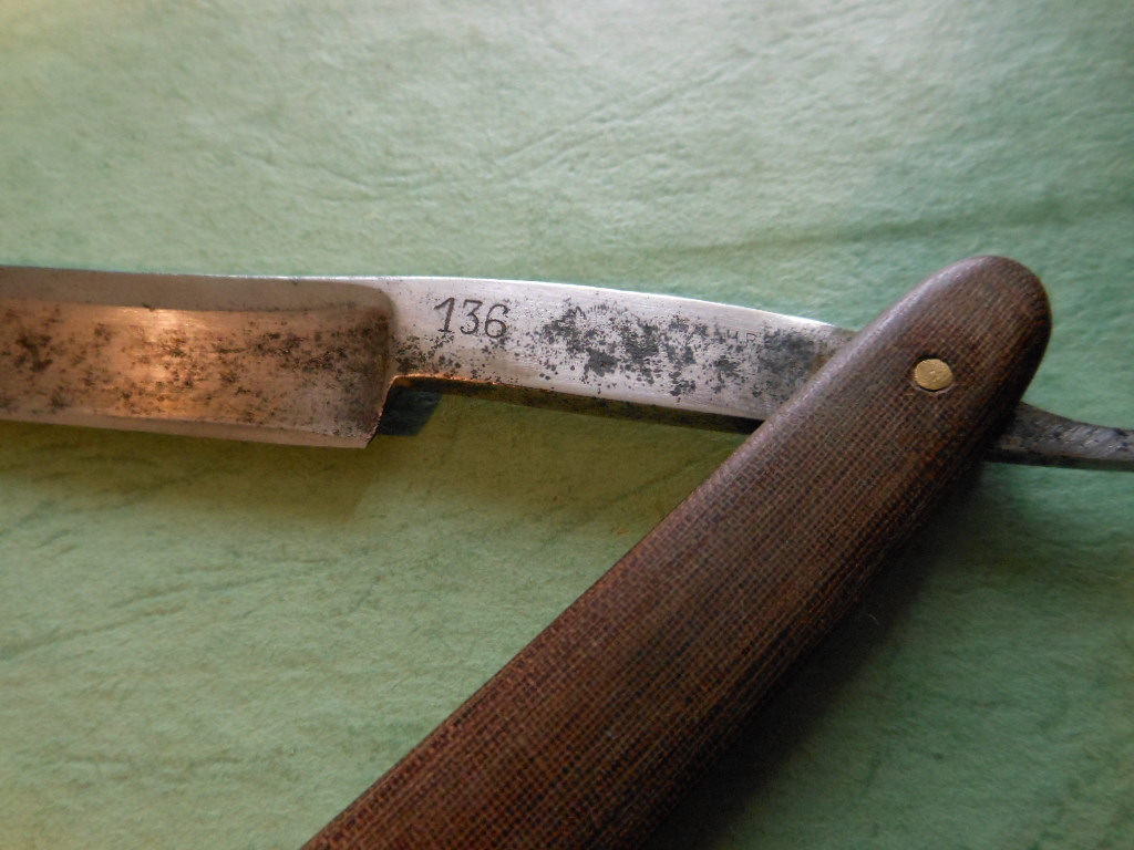 вот тут, надысь, пришлось ехать из Рязани в Смоленск с напарником в качестве пассажира, а накануне принесли мне бритву -- ну как бритву -- кусок ржавчины с текстолитовой ручкой. что бы было не скучно, взял я ее с собой, ну и наждачки набор)))). В общем 4 часа мне было чем заняться, а потом я загрустил, т. к коррозия страшная. После наждачки пропала травленая на клинке надпись, которая почти не читалась. Приехав, переклепал ручку и поточив -- отложил. Кстати пин стальной родной, а шайба медный сплав. А вчера дошли руки, прошелся по ремню с ГОИ , потом по гладкому и побрился.... Как говорится звезда была в шоке.... бритва бреет супер. ВОТ ТОЛЬКО ЧТО ЗА БРИТВА? клейма почти не видно, но что то вроде кабана. ну и цифры 136 что они значат?