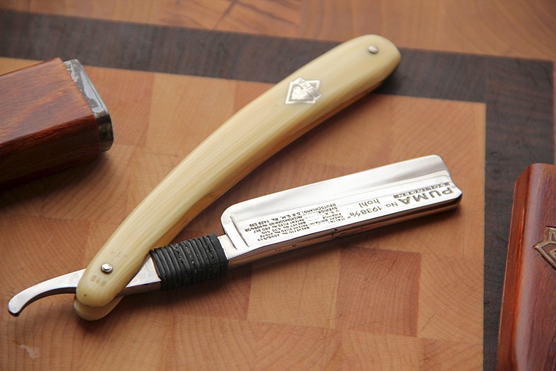 По всей видимости бритва хоть и очень старая, но не пользованная. По крайней мере следов заточки и юза я не заметил. Ручку снял,почистил место крепления оправы с металлом, приспособил новую резинку, собрал снова, сохранив все оригинальные шайбы. Лезвие не имеет никаких изъянов; ни коррозии, ни трещин, за исключением нескольких каверн на обушке, но они ни на что не влияют.Сталь твёрдая, как у всех Пум, зато заточку держит хорошо. Надолго хватит. Геометрия бритвы идеальна: кромка тоненькая и равномерно-одинакова по всей длине лезвия.