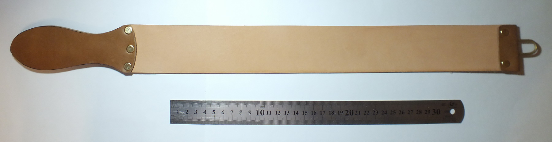 Кожа растительного дубления, высшего сорта из США (Herman Oak), Петля кожаная, ось - латунь. Размер 52мм на 62 см. Рабочая часть 41 см. Рукоятка "дутая" с пенопленовым вкладышем. Снято с продажи. Spoiler Show