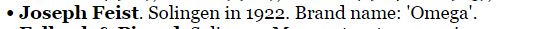 Re: Joseph FeistКомпания Joseph Feist была в бизнесе 1898-1924. Расположена в № 18 Dolnerstrasse, Золингене. Торговые марки: Blenda, Glücks-Messer, LA SEMEUSE, MPN, OMEGA, SOSIMA, VIOLET, WANDERHEIL. Производила ножи (перочинные "карманные"), бритвы, столовые приборы, ножницы. http://www.archivingindustry.com/cutler ... makers.htm Так что - выпуск около 1922 года. Вещь! Фабрика Йозефа Файста — «OMEGA» — была основана в 1864 году, в 1888 году носила название «Joseph Feist Nachf. Omega — Werk» (наследники Йозефа Файста). Фирма выпускала широкий ассортимент товаров, имела торговые связи с Польшей и Россией. Поскольку семья Файст имела еврейские корни, в 1941 году фабрика была национализирована нацистским правительством, а ее члены эмигрировали в Лиссабон, где проживают до сих пор. С 1941 года фабрика носила название «Omega-Werk Hartmann&Co», c 1997 года – «Omega Herbert Kleber», в 2003 году она еще раз сменила владельца. До последнего времени производила дешевые кухонные ножи, экспортировавшиеся в Турцию. В 2013 году фабрика прекратила свое существование. 21 октября 2013 года оба ветхих здания фабрики постройки 1900 года были снесены. http://muzei-nozhnic.ru/nozhnicy-dlya-v ... vejcariya/