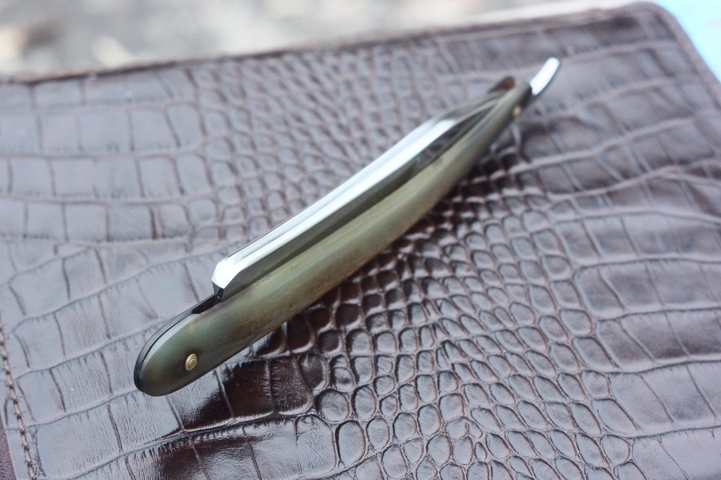 Re: Продаётся от KarangiWade and Butcher. Старая бритва. 5\8 На ерле присутствуют небольшие следы времени, при профилактики которых надпись стала просматриваться с трудом. Но, как писал форумчанин -"От этого он СтИзом не стал". Ручка рог в прекраснейшем состоянии. Интересная геометрия. Мощный обух (6 мм). Возле головы с лицевой стороны слегка неравномерная кромка (чуть шире). Бритва до заточки по всей видимости в использовании не была! Замечательный рез волоса. Заточка N*X*S. Продана