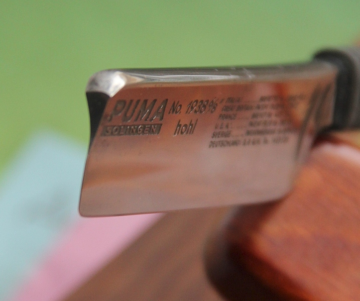 По всей видимости бритва хоть и очень старая, но не пользованная. По крайней мере следов заточки и юза я не заметил. Ручку снял,почистил место крепления оправы с металлом, приспособил новую резинку, собрал снова, сохранив все оригинальные шайбы. Лезвие не имеет никаких изъянов; ни коррозии, ни трещин, за исключением нескольких каверн на обушке, но они ни на что не влияют.Сталь твёрдая, как у всех Пум, зато заточку держит хорошо. Надолго хватит. Геометрия бритвы идеальна: кромка тоненькая и равномерно-одинакова по всей длине лезвия.