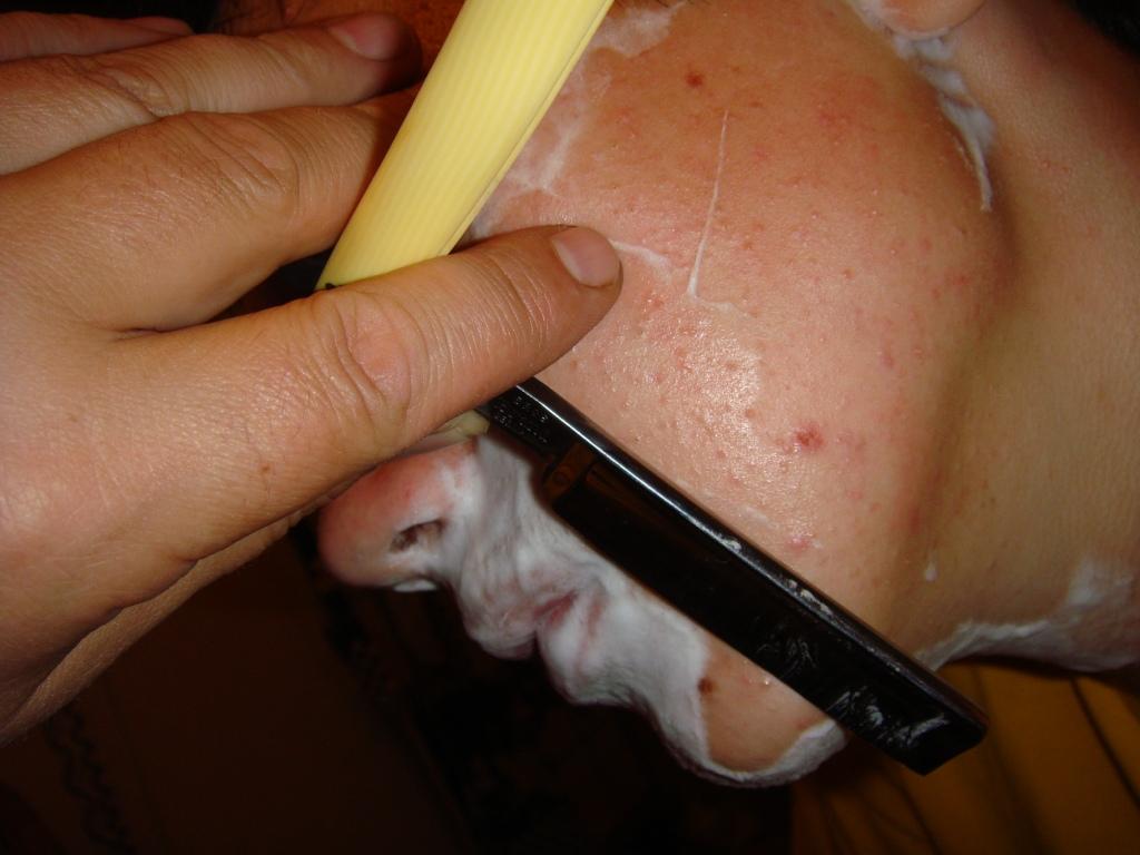 Текущее время: 17.12.25, 23:45 Respect to Tras Krom. Использование WESTER BROS.Модераторы: Олег Бритва, Модераторы Respect to Tras Krom. Использование WESTER BROS.Привезли сегодня Wester Bros... Внешний осмотр бритвы в целом - 4+, лезвие - твердая 5. Ручка с небольшим дефектом, смещение по оси щёчек ручки (но и наплевать на это, скорее всего пины и клепка не родные), потертости на внутренней стороне - тоже фигня. Заточка - отлично. С утра уже побрился, было мучительно думать о том, что сегодня бритву не опробую... По приходу домой выход был найден - у старшего (14 лет, пубертатно-прыщаво-пушковый период)по всему лицу пух, длиной до 4-6 мм, козлиная бородка. Нам с супругой надоел этот вид уже давненько. Сын ни разу не брился... По обоюдному согласию (даже уговаривать не пришлось, сына, я имею ввиду) сын был немного распарен, намылен...и выбрит. Ощущения бреющего немногим отличаются от бреющегося, тот же кайф и выброс адреналина. Бреет отлично, тем более брился мягкий пух, а не торчащая щетина....Короче, фото ниже. Единственное, упустил, догадался фоткать только после намыливания.... Качество, конечно, никакое...в одной руке бритва, в другой фотоаппарат... Естественно кадры сделаны не в момент бритья, а после провода бритвы...Уж извините...