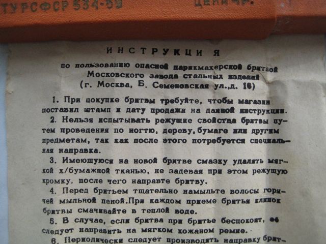 Я дважды покупал стизовские бритвы в советских магазинах, но инструкций при них не помню. Микрокорундовый "брусок для правки бритв" был с инструкцией, и к натяжному ремню (с одной стороны гладкая кожа, с другой — брезент) прилагалась инструкция, хорошо помню, а к бритвам — нет. Кто что может возразить? может, память меня подводит? ...и немедленно выпил.