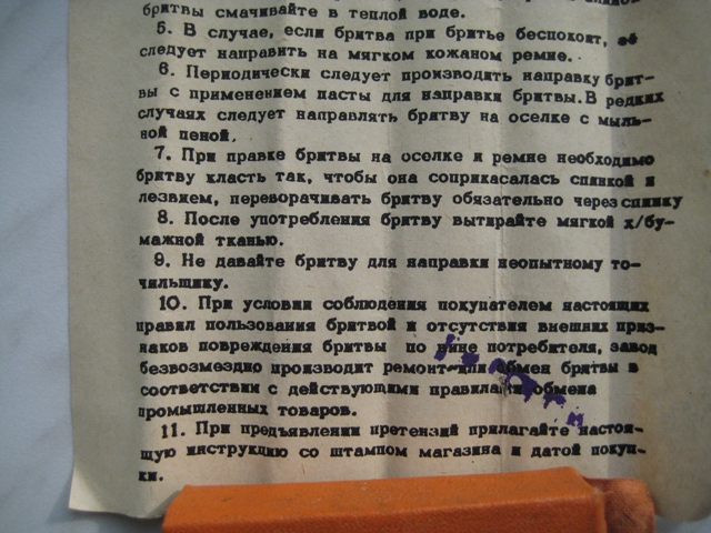 Я дважды покупал стизовские бритвы в советских магазинах, но инструкций при них не помню. Микрокорундовый "брусок для правки бритв" был с инструкцией, и к натяжному ремню (с одной стороны гладкая кожа, с другой — брезент) прилагалась инструкция, хорошо помню, а к бритвам — нет. Кто что может возразить? может, память меня подводит? ...и немедленно выпил.