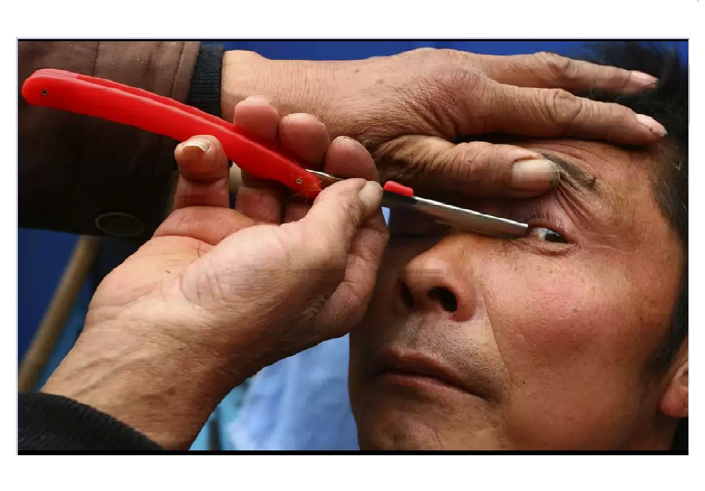 23 февраля, Суйнин, провинция Сычуань, Китай. Уличный парикмахер использует бритву чтобы удалить соринку с века своего клиента