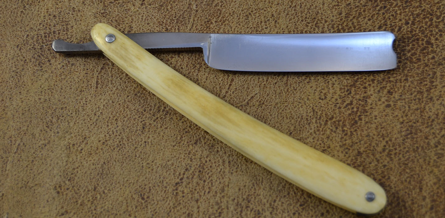 Англия. Предположительно первая половина 19 века. Ширина 6/8. Рукоять со слоновьего бивня. Необычный трехгранный обушок, массивный ухватистый эрль. Заточена, готова к бритью Цена 245$ Spoiler Show