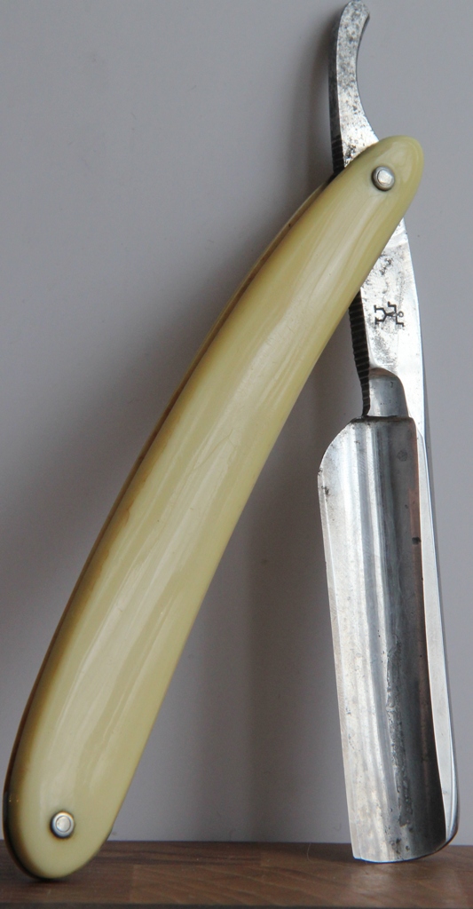 Прокладкой между частями ручки служит свинцовый металл. К сожалению, такие перламутровые ручки довольно хрупки. Большая удача для современного коллекционера – найти образец этой красивейшей ручки без трещин и сколов. Мне повезло найти две такие бритвы, но обе были со сломанными ручками. Было отмечено, что ручки были разных размеров под разную ширину бритв.