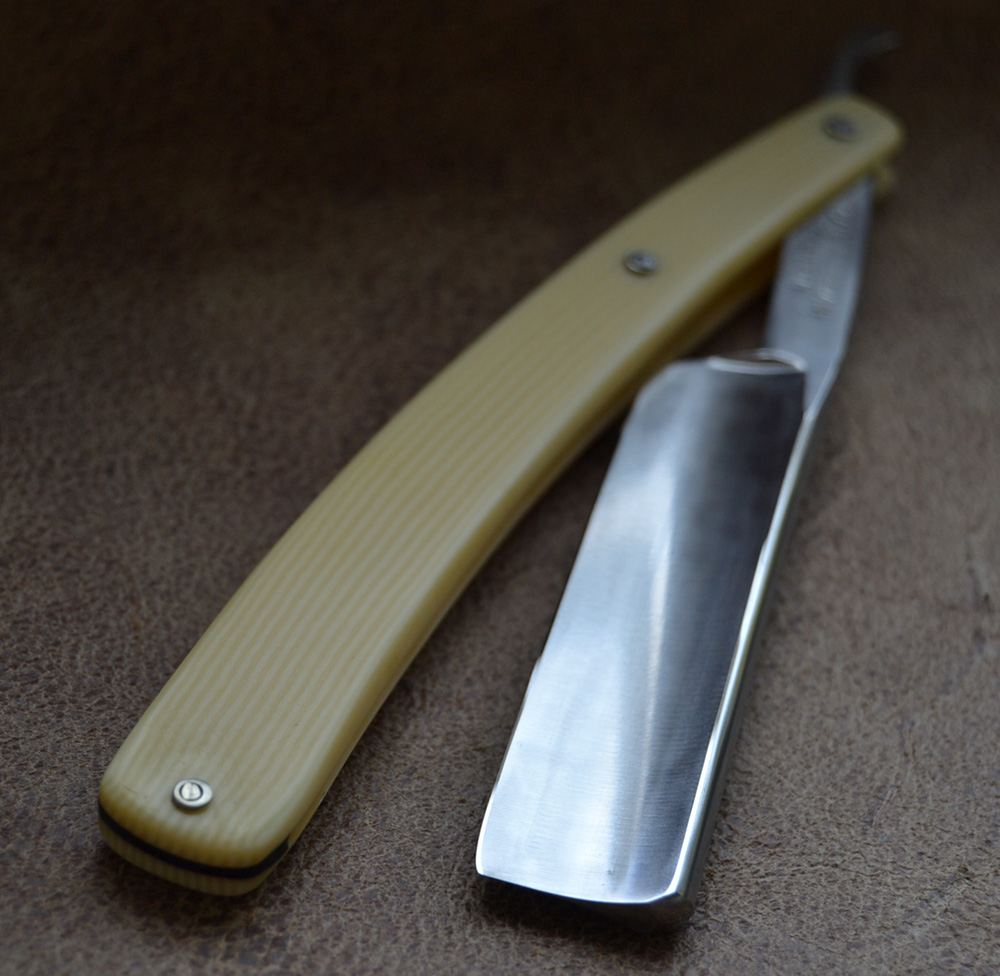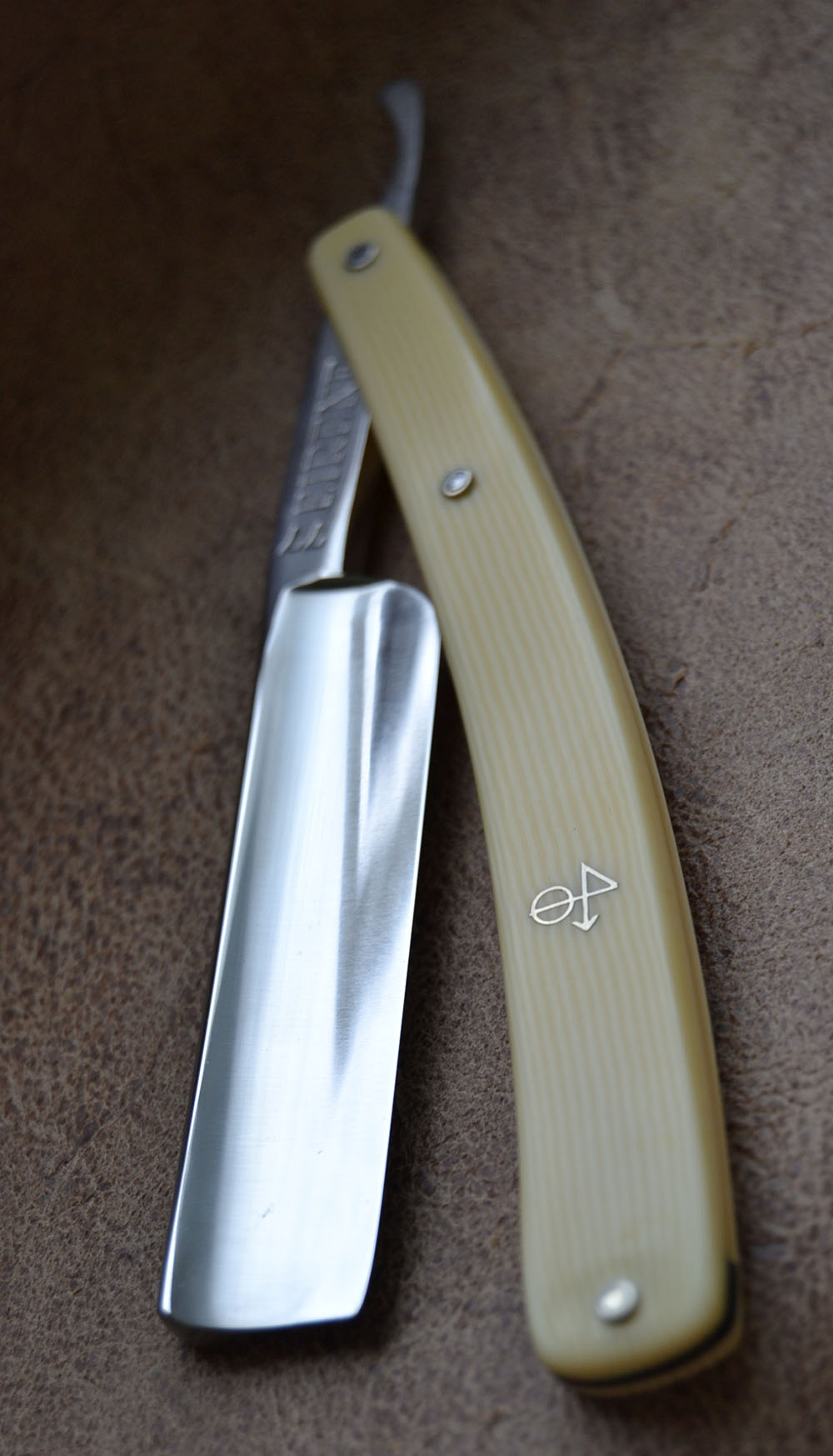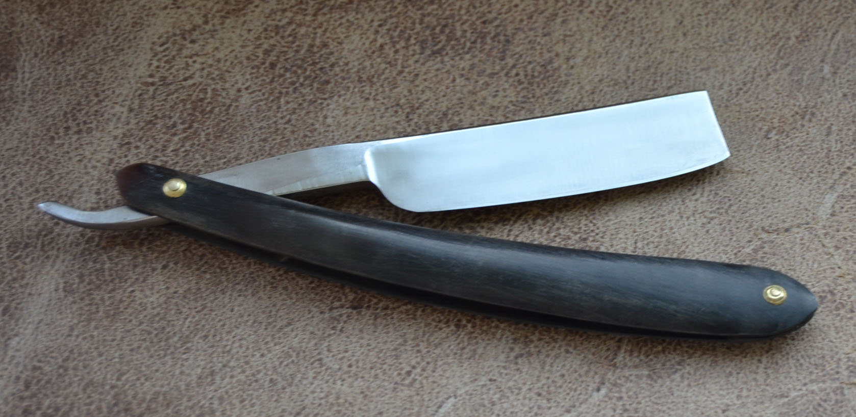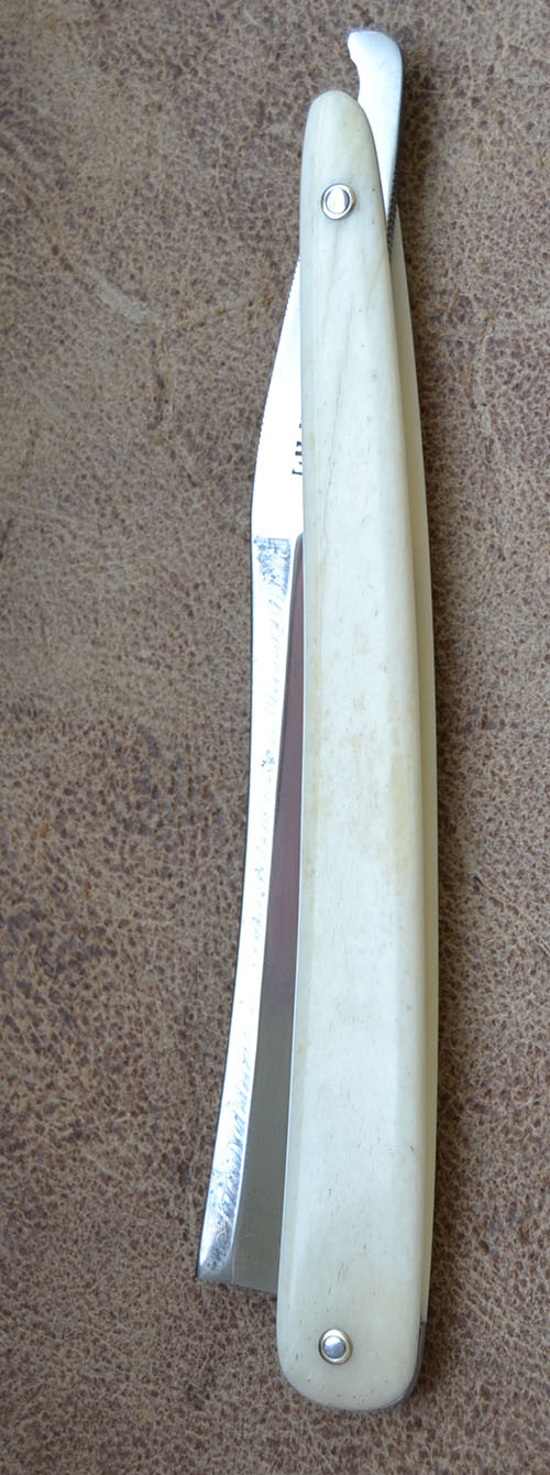 Старая Франция, предположительно начало XIX века. Массивный клин 7/8, рукоять рог, клинышек кость. При разборке обнаружилось еще одно скрытое клеймо. Отличная бритва в лучших традициях старой Франции. Продано Spoiler Show