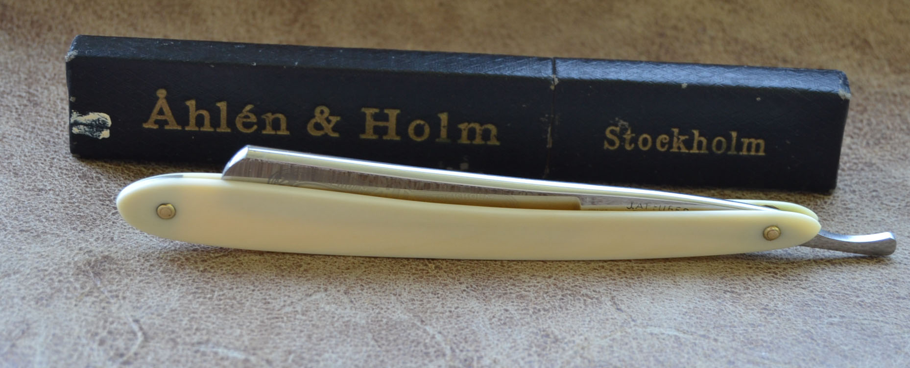 Швеция. Старая неиспользованная бритва. 4/8 По вогнутости близка к клину.Заточена на камнях без изоленты. Рукоять из слоновой кости. довольно распространенная модель, но травление говорит о том, что эта серия бритв была предназначена для компании Åhlén & Holm. Уж не знаю для каких целей им понадобились бритвы =) История компании Spoiler Show https://www.ahlens.se/om-oss/historia/" onclick="window.open(this.href);return false; продано Spoiler Show