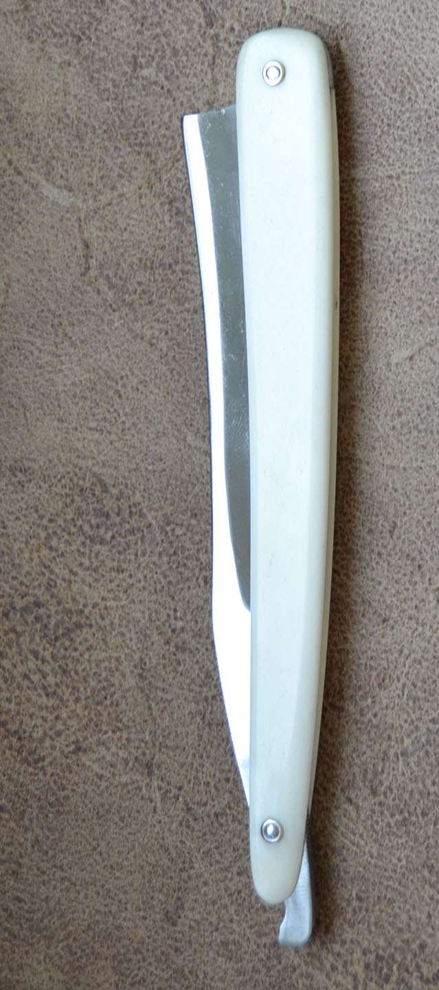 Старая Франция, предположительно начало XIX века. Массивный клин 7/8, рукоять рог, клинышек кость. При разборке обнаружилось еще одно скрытое клеймо. Отличная бритва в лучших традициях старой Франции. Продано Spoiler Show