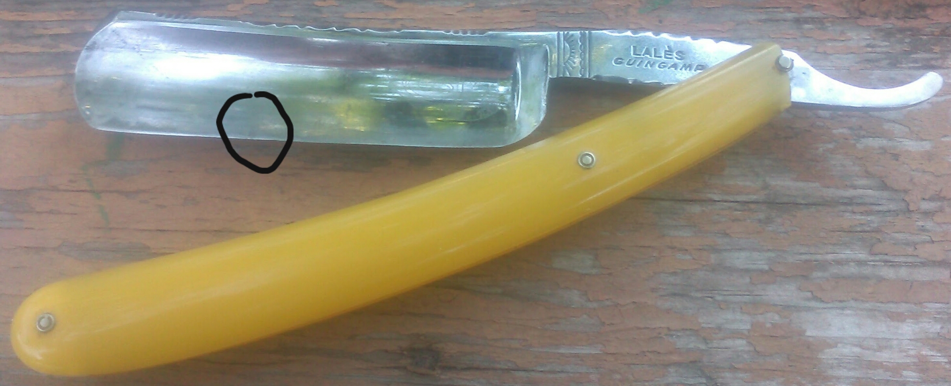 Помогите определить бритвуПопала в руки вот эта бритва но информации по фирме и модели найти не могу. Предполагаю что она французская. У бритвы два дефекта, поломана ручка (без клейм), и перпендикулярная трещина на режущей кромке около 5 мм. Надеюсь на Вашу помощь