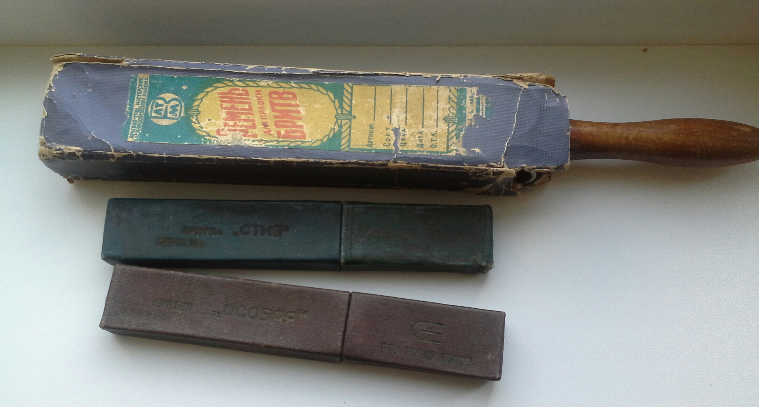 Результат стихийного похода. Потрачено 20минут и 20$ 1) Ремень для правки бритв ЛТП Василеостровского района 64г. Вполне рабочий с живой кожей, механизм практически новый. 2) Стиз "Особая" 70г. 3) Стиз #9 52г