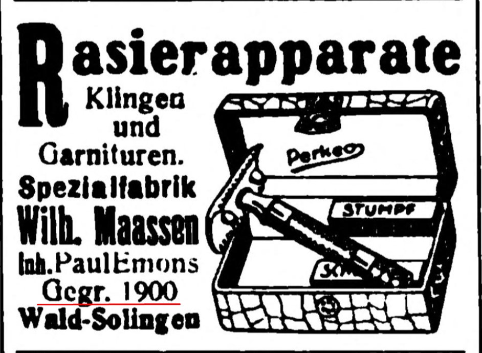 Wilhelm Maassen, Inh. Paul Emons. Основано в 1900. Solingen-Wald, Altenhofer Strasse 20 в 1922 и 1939.