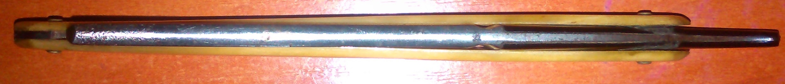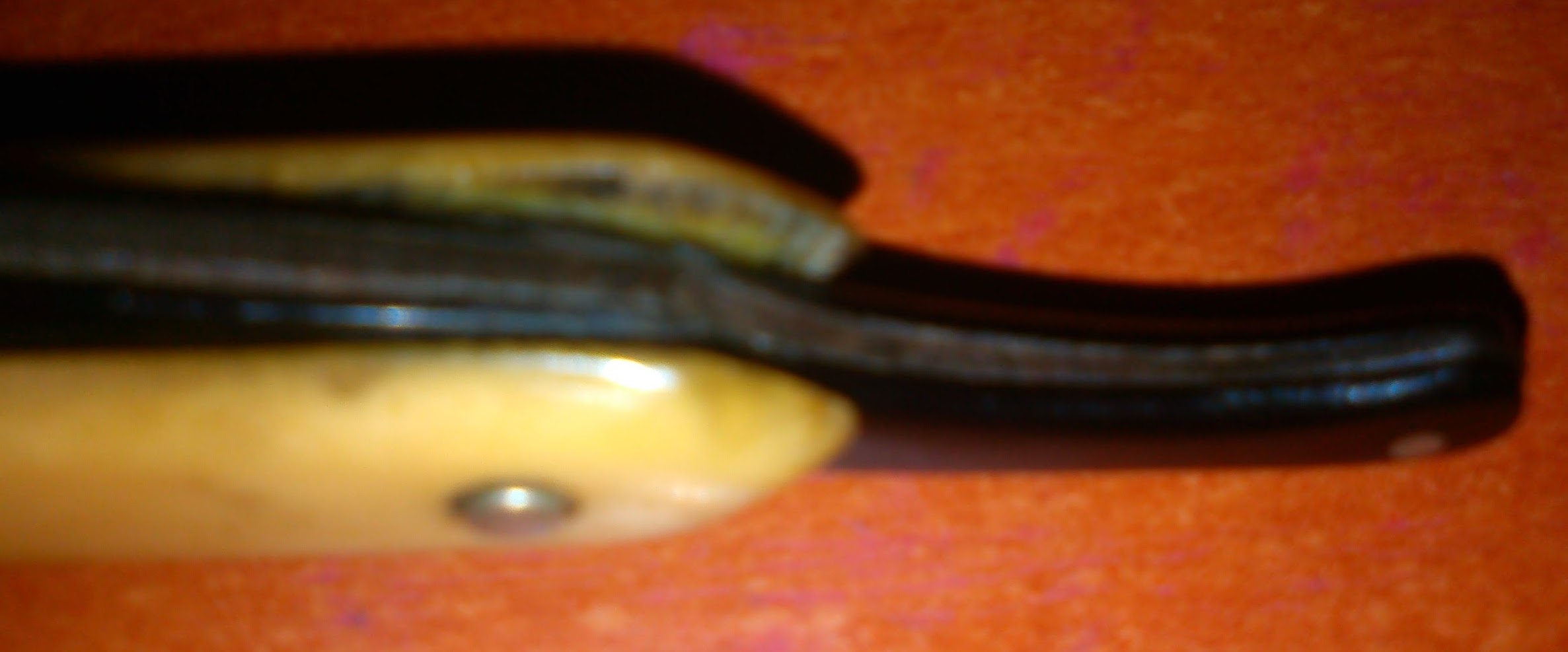 Re: Помогите, пожалуйста, определить бритвуНемного разобрался, такое исполнение называется "covered tang" (покрытый хвост). Многие производители делали подобные модели бритв, часто клеймо ставилось краской прямо на покрытие хвостовика, которое могло быть из целлулоида, пластика, перламутра и т.д. К сожалению определить производителя по хвостовику не получится, значит бритва "noname".