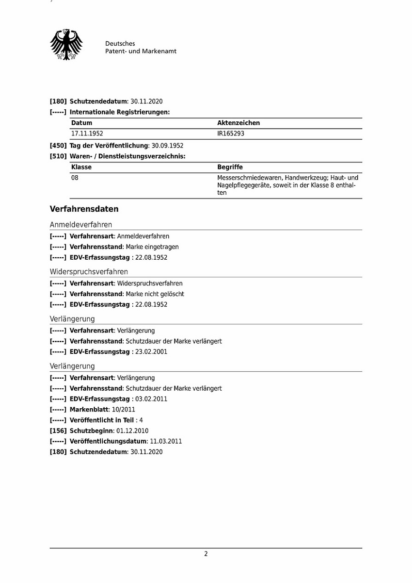 Двести пятьдесят лет Золинген столовых приборов: Gottlieb Hammesfahr, Золинген-Foche; 1684-1934; [Festschrift] / автор Франц Hendrichs (Zweihundertfünfzig Jahre Solinger Messerschmiede : Gottlieb Hammesfahr, Solingen-Foche ; 1684-1934 ; [Festschrift] / Franz Hendrichs) https://portal.dnb.de/opac.htm?method=s ... D580908011" onclick="window.open(this.href);return false; кто будет мимо проходить - отсканируйте, пожалуйста))), там все ответы.... по ходу это другой Hammesfahr. Торговый знак зарегистрирован в 17/11/1952 года. в 2011 года действие патента продлено до 2020 года. Так, что живы, курилки)) класс патента: столовые приборы, ручные инструменты, оборудование по уходу за кожей и ногтями. кол. человек: 8-19 под катом ссылка и копия с сайта регистрации торговых марок Германии Spoiler Show