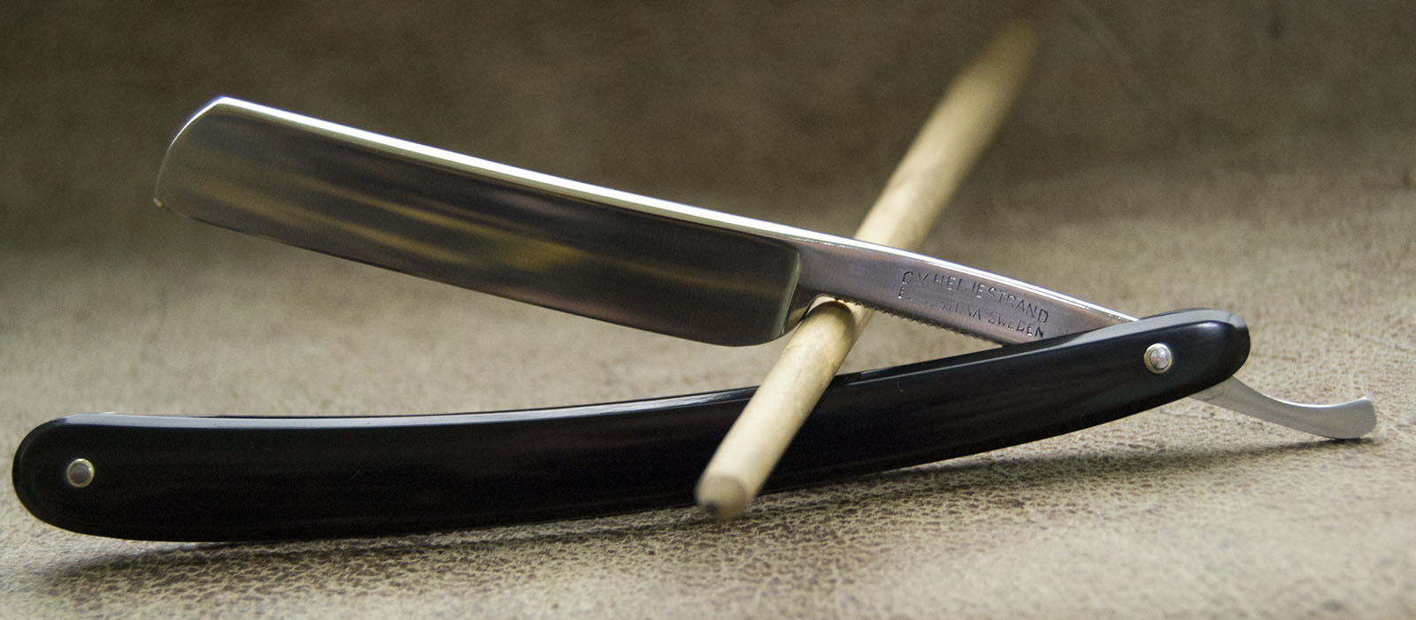Швеция. Одна из самый распространенных моделей от Карла Виктора Хельестранда - маневренная и удобная бритва. Ширина 4/8, рукоять эбонит. Три короны - сделана для магазина Магнуса Киндала в Париже. Заточена, готова к бритью. Продано Spoiler Show