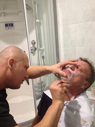 Человек постарше меня, карьеру свою начинал военным летчиком, говорит, что в молодости в парикмахерской испытал бритье опасной... Из инструметов: - бритва Wade & Butcher (куплена здесь, ну соответсвенно и заточена прекрасно); - ремень подвесной Накояяма; - помазок Baxter of California - барсук; - мыло Dr. Dittmar и капля крема Arko. Товарищ в восторге. Смотрели и фотографировали две барышни (тоже коллеги). После процесса они своими женскими ручками прощупали и сказали "офигеть". Сказали, что будут от мужей своих требовать такого же результата (по ходу, подставил я двух незнакомых мне мужчин). Брить другого человека сложнее чем себя, ибо не чувствуешь как идет. Но, неплохо получилось, гладко все и только одна кровая точка на шее. Ниже фото процесса. Последняя фото - рюмка Текилы после процесса. Настроение у всех отличное.