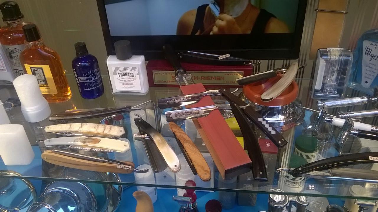 Впечатлений море, но не от бритв. Бритв совсем немного было. Престарелая дама ростом с "мнеподмышку" заявила, что найти новую филармонику нереально потому что их не выпускают более 50(!) лет. И предложила мне на выбор десятка три бритв. Из них около половины DOVO, штуки четыре Wacker, парочка ThiersIssard и три каких то кастомных с мозгососущим дизайном. Цены достаточно квадратные, самая дешевая дово 5\8 стоит 98 евро. К слову в цвиллингвском магазине в Дюссельдорфе я ее купил за 65))). Вакеры 210-460 евро, тиерсы - 340-410, кастомы даже спрашивать не стал, не люблю дизайн отличный от классического. Так же в магазе представлен огромный выбор помазком и косметики. И самое главное, что меня впечатлило - выбор ножей просто огромен. И камней. Была даже накаяма бритвенного размера, но смутила цена в 4 сотни евро. В общем как то так. Вот фото: