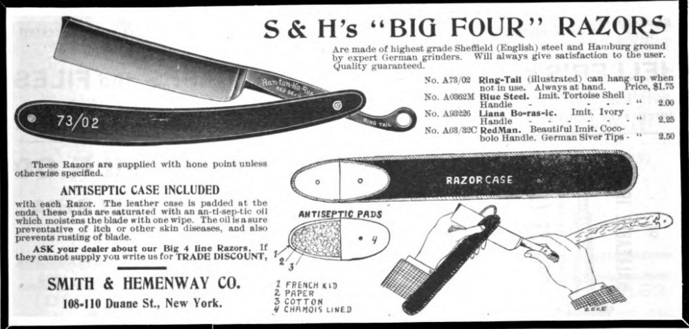 Картинка о том, что и тогда были озабочены уходом за бритвой, как и чем ее протирать. Вот и придумали многофункциональный чехол, который всегда с собой, да еще снабжен "антисептическими сторонами" для протирки.