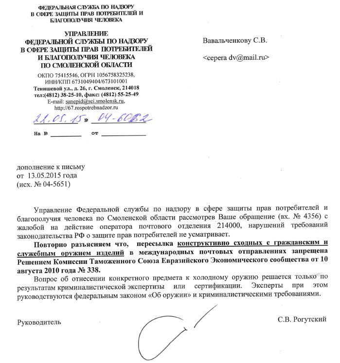 Только Министру Связи и копии всяким мелким начальникам, чтоб знали суки кто на них настучал. В Роспотребнадзор бесполезно. Они там сильно огорчаются, когда у них над головой расходится окно в ряске и светит сквозь него солнце. Я отправлял как то baa в Германию бритву, так на главпочтамте в Смоленске вышел казус. Признали в бритве нож Боуи. Попытки возражать, привели к стягиванию к окну оператора всего персонала отделения, размахиванию руками, брызганью слюной и утверждению, что я верблюд. Я сказал:"Ладно, кобыла, я те ща намажу. Жди привета от министра". И пошел писать жалобу. Накатал три телеги Министру, начальнику ПР, начальнику ихнего надзора и в Ростелеком. Первым ответил Ростелеком, типа гражданин вы чудак. Почта всегда права. Потом ответил министр. С извинениями. Что меня устроило. Пошел и отправил бритву без проблем. Кобылу борзую, кстати уволили. Моя переписка с козлами: 32 года активно мусолю харю клинковой бритвой