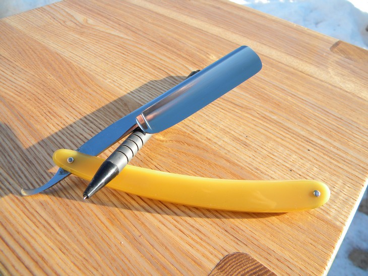 Так как бритва не с хранения, а с коллекции, пластик имеет следы времени - пожелтения.