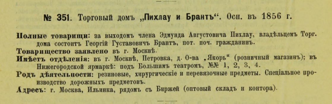 "ПИХЛАУ и БРАНТЪ" - существует с 25 января 1884 года. За выходом члена Эдмунда Августовича Пихлау, представителем торгового дома состоит Георгий Вильгельм Брант , потомственный почетный гражданин. Торгует резиновым и гуттаперчивым товаром.... данные точные Spoiler Show О ЧЕМ ПИСАЛИ ПСКОВСКИЕ ГАЗЕТЫ: "НОВОЕ ОБЩЕСТВО" Во вторник, 5 ноября, в зале "семейного кружка" происходило первое общее собрание только что утвержденного псковского велосипедного общества. В этом собрании были произведены выборы "должностных" лиц общества. Председателем и вице-председателем общества единогласно избраны И. Н. Новосильцев и Р. А. Прейс, казначеем В. С. Седельщиков, секретарем В. М. Кацнельсон, распорядителем П. А. Адамович и врачом Э. А. Пихлау. "Псковский городской листок", 1896, № 85 Re: pychlau & brandt moskauДа работа большая, респект и уважение