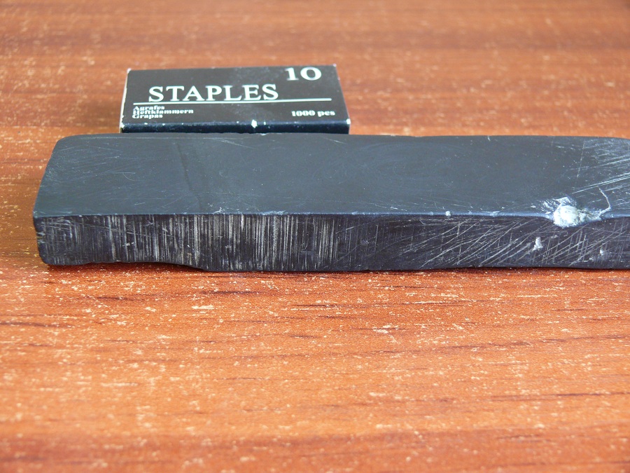 Re: Помогите определить каменьПрошу помочь. Камень из гаража в России. Про историю больше нет информации. Самостоятельно определил что сланец, достаточно твердый, эмульсия белого цвета (сухая) выделяется со средней скоростью. Пробовал на бритве около 10 000 по яп. примерно. Включений пирита нет. Помогут только размеры: дюймы 5х1-1/4х1/2, в мм. 128х30х13. Коробка рядом с фото черная. На последнем снимке с наполовину просохшей эмульсией.