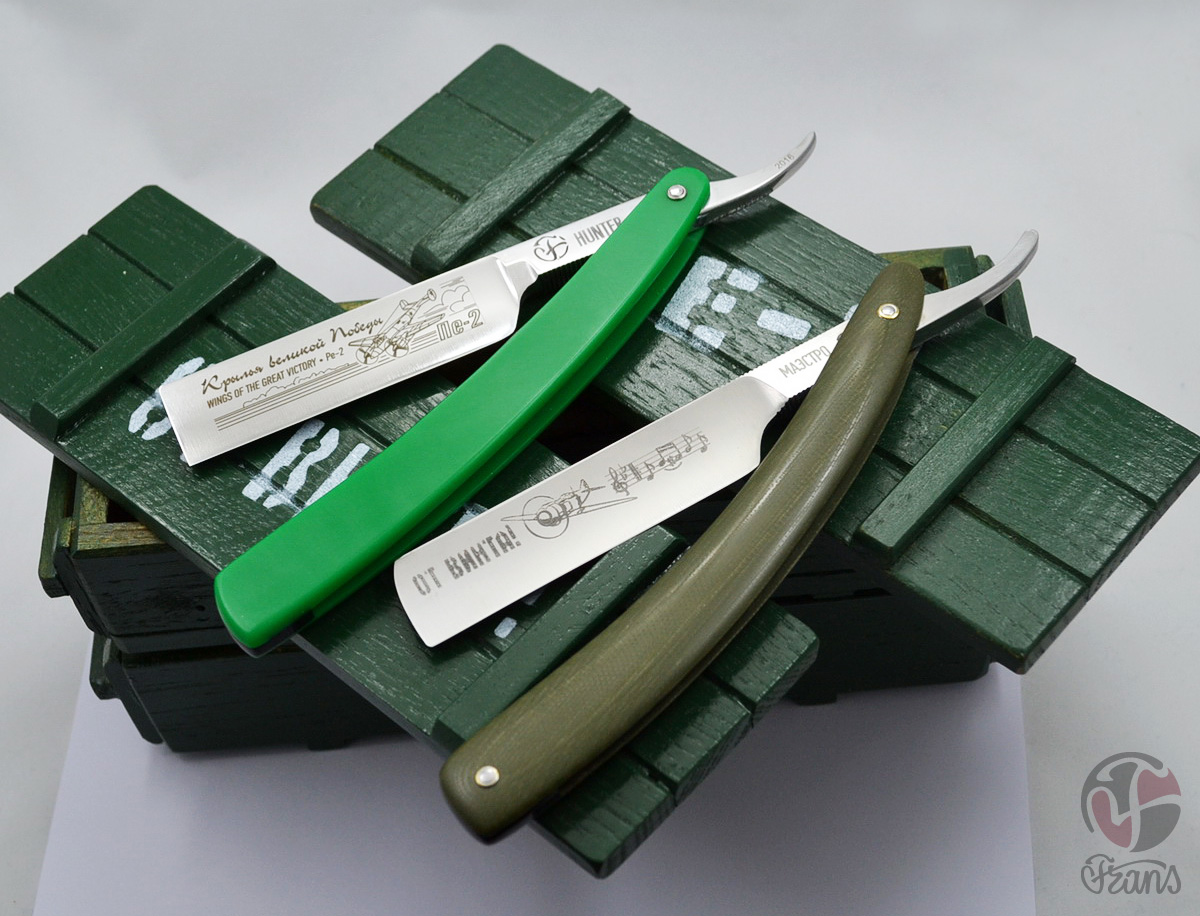 Продолжаем авиационную серию. Бритва: HUNTER Пе-2 Сталь: Uddeholm Arne(Швеция) Ширина - 6/8 Вогнутость - 1/4 Ручка - акрил(матовый) Ящик "Пе-2" - дуб