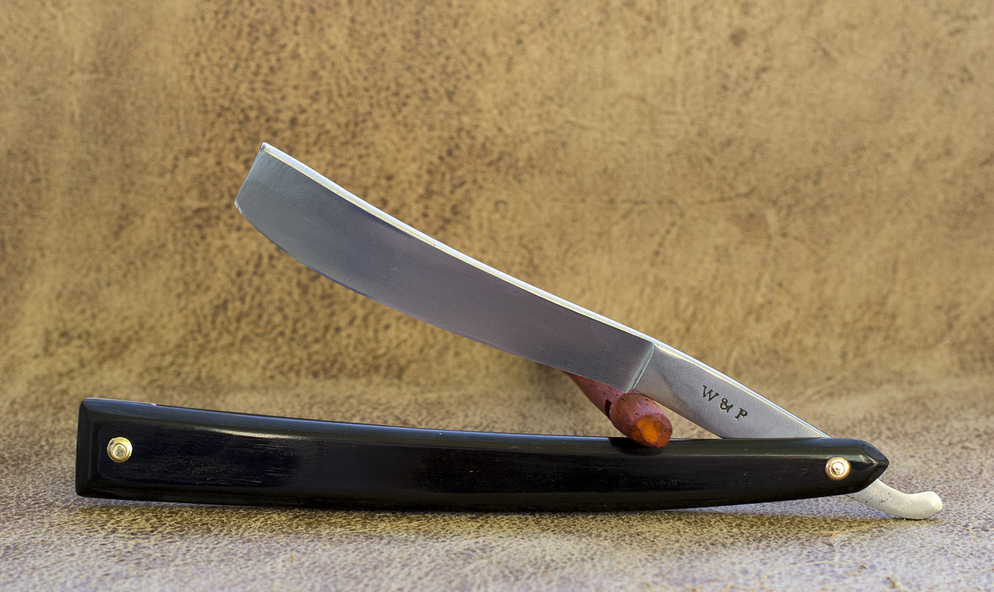 Ширина бритвы 18.5 мм. Новая роговая рукоять, обушок и эрл с дополнительными гранями, придающими неповторимую форму спинке. Бритва середины 19 века и как это часто бывает, рукоять не дожила до наших дней, была изготовлена новая из рога буйвола. Продано Spoiler Show