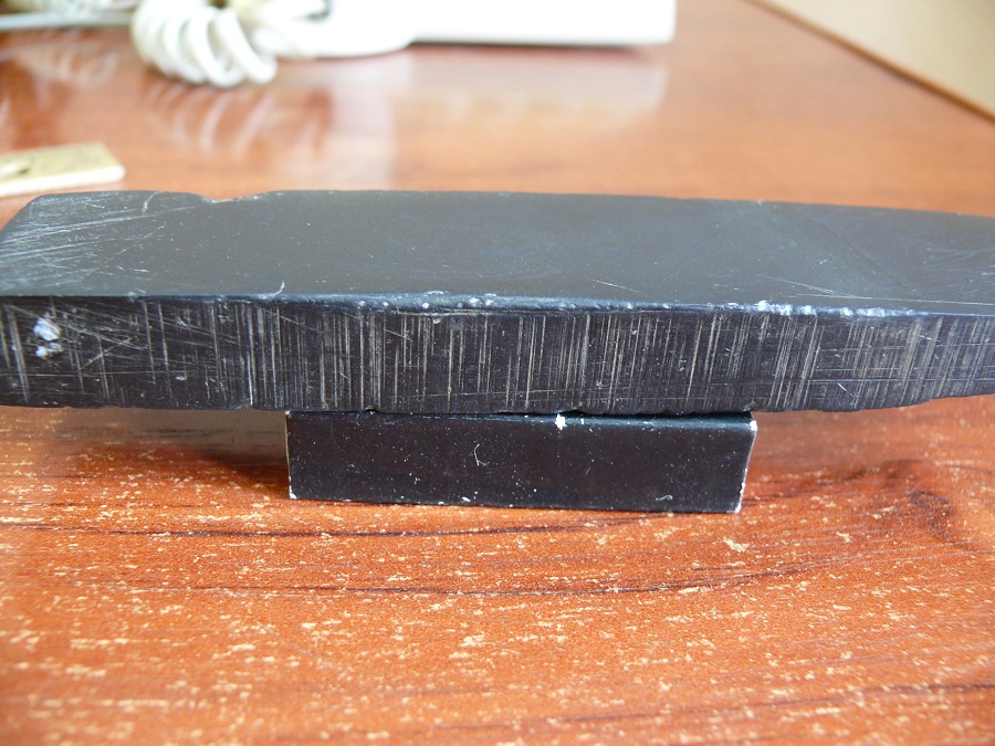Re: Помогите определить каменьПрошу помочь. Камень из гаража в России. Про историю больше нет информации. Самостоятельно определил что сланец, достаточно твердый, эмульсия белого цвета (сухая) выделяется со средней скоростью. Пробовал на бритве около 10 000 по яп. примерно. Включений пирита нет. Помогут только размеры: дюймы 5х1-1/4х1/2, в мм. 128х30х13. Коробка рядом с фото черная. На последнем снимке с наполовину просохшей эмульсией.