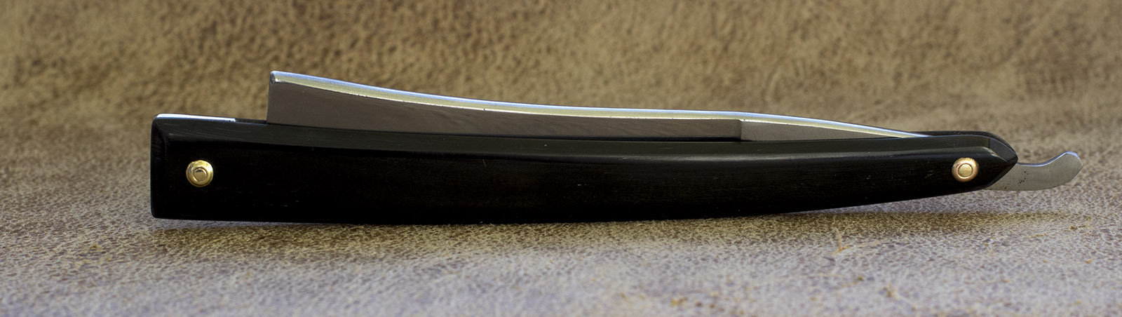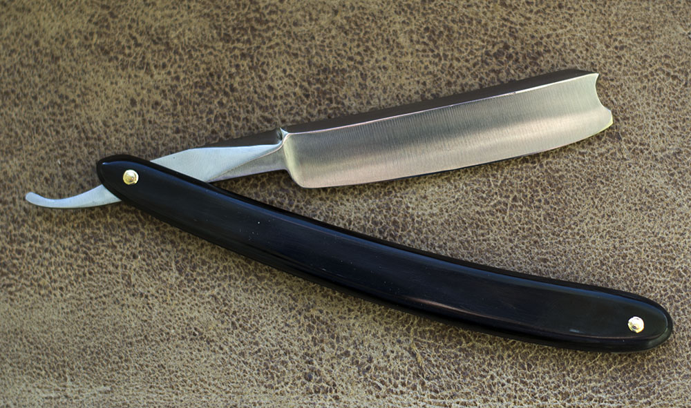 Ширина бритвы 18.5 мм. Новая роговая рукоять, обушок и эрл с дополнительными гранями, придающими неповторимую форму спинке. Бритва середины 19 века и как это часто бывает, рукоять не дожила до наших дней, была изготовлена новая из рога буйвола. Продано Spoiler Show
