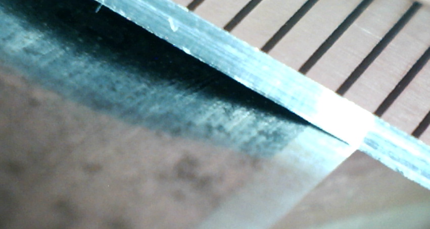 На выходе получаем не совсем красивую бритву, зато просто идеально сведенную в ноль. Специально приложил стальную линейку и фоткал сбоку чтобы были видны точки касания (фоткал кстати китайским микроскопом  - он кстати выворачивается и в минус увеличения - с фокусировкой сантиметров в 40)