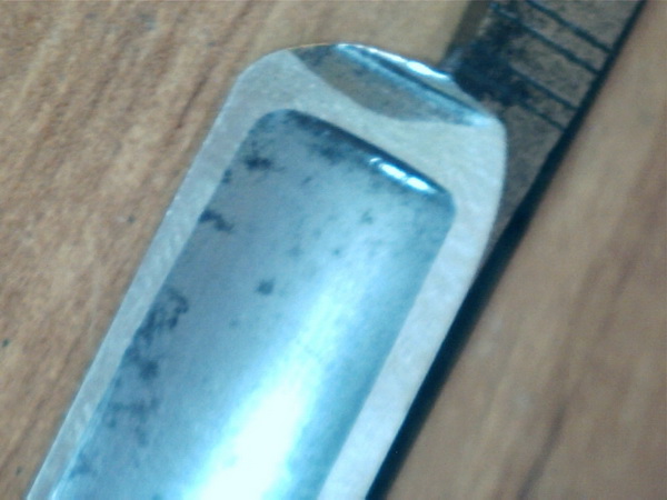 На выходе получаем не совсем красивую бритву, зато просто идеально сведенную в ноль. Специально приложил стальную линейку и фоткал сбоку чтобы были видны точки касания (фоткал кстати китайским микроскопом  - он кстати выворачивается и в минус увеличения - с фокусировкой сантиметров в 40)
