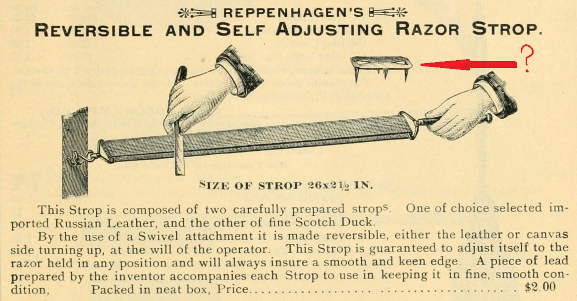 рекламное описание к ремню: This Strop is composed of two carefully prepared strops, imported Russian Leather, and the other of fine Scotch Duck. By the use of a Swivel attachment it is made reversible, either the leather or canvas side turning up, at the will of the operator. This Strop is guaranteed to adjust itself to the razor held in any position and will always insure a smooth and keen edge. A piece of lead prepared by the inventor accompanies each Strop to use in keeping it in fine, smooth condition, Packed in neat box, Price $2.00 Что это такое и зачем? PS ответа я не знаю, надеюсь на коллективный разум. Перевод я тоже не понял. Вроде что-то объясняется, но - что? не понятно. Уж точно не в стенку вбивать....