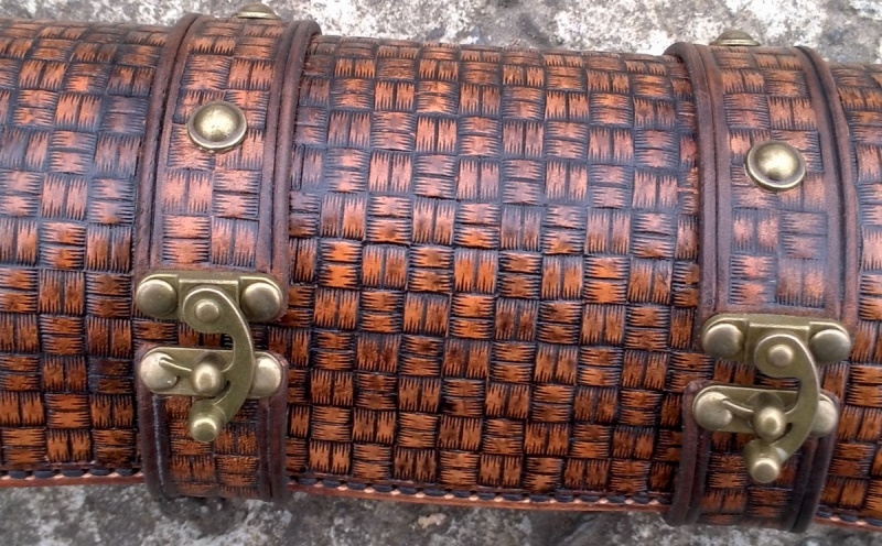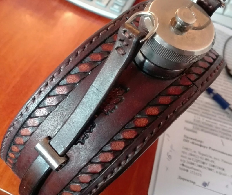 Фляга ок. 1 л, нержавейка СССР, стенки толстые, прокладка под крышкой задубенела и развалилась потому ее заменил на кожаную, пропитанную пчелиным воском. Тиснением сделан солнечный крест.