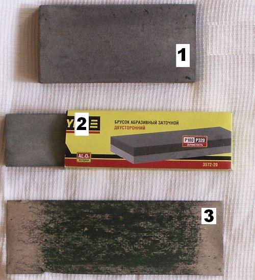 Именно этот "ужос" — пара электрокорундовых китайских абразивных заточных двусторонних брусков Stayer 150х50х25 зернистостью Р180+Р320 по 41 руб. — и решил дело после недельных мучений сначала на японском тысячнике, потом на наждачке-нулёвке с алмазной притирочной пастой 28-80 мкм. Лишь на стороне 180 грит (на стороне 320 грит бритва, если не налегать на неё сильно, почему-то просто скользила) появилась производительность, позволившая ликвидировать искривление бритвы-нержавейки в 1,5 мм.