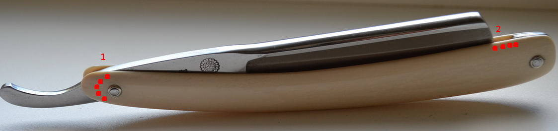 Работы ювелирные конечно - обзавидуешься! Не представляю сколько ручек надо угробить чтоб приблизиться ((( Сам склонен к лаконичным вещам по природе. В связи с этим накопилось пару вопросов: 1. для чего так удлиняют некоторые ручку в месте под №1 на рис.? Почему не сделать по пунктиру "красным"? 2. для чего оставлен такой "проём" в месте под №2 на рис.? 3. клинышек из металла (олово там или латунь...) для практической цели или из эстетики? Планирую сделать первую ручку из дерева - клинышек из того же дерева использовать нельзя? По п.п.1 и 2 : это дань традиции какой-то? Это прочнее? Это удобно чем-то? Или просто так красивее? По п.3 : я понимаю набалдашник на основании ручки ножа - и бить им можно (и по нему), и ручку бережёт, и баланс оружия... В бритве это ИМХО лишнее - и относишься к ней бережней, и баланс не нужен (лично я держу бритву за лезвие и слабо ощущаю массу ручки) (фото своровал тут же в ветке ...активное неприятие любой традиции - столь же очевидная глупость, как и слепая приверженостей ей. Верное решение всегда находиться между "да" и "нет"!