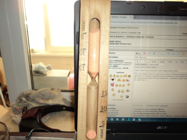 Re: Наши часыПесочные часы-мое безбелие,в гостьх увидел,задавила жаба ,пошел в медтехнику купил медицинские, "Макентош"сварганил сам,теперь иногда завожу и наслаждаюсь как течет время....целых 20минут.