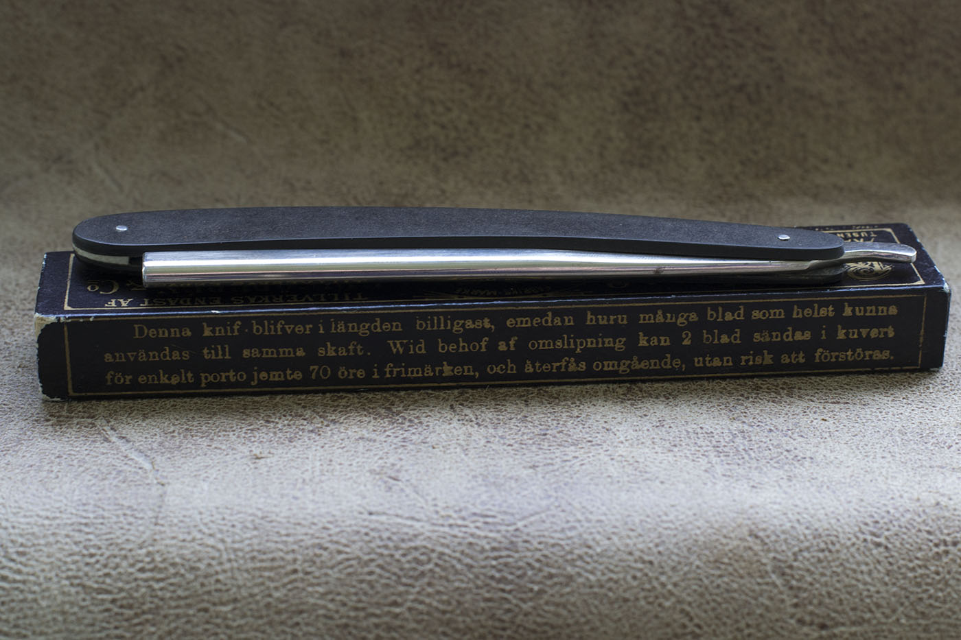 Опасная бритва типа фрембэк от известного шведского производителя. Предположительно второй половины 19 века. Надежная система фиксации лезвий, позволяет получить полноценную опасную бритву при этом иметь в запасе 2 острых наточенных лезвия. Бритва не имеет следов заточки на обушке из чего можно предположить что она не была в использовании - однако лезвия до сих пор очень острые, возможно были заточены на заводе. Ширина полотна 21.7 мм . почти 7/8, обушок 5.2 мм . В комплекте родная коробка в очень хорошем сохране и 2 лезвия. Сталь на подобных шведских фреймах всегда казалась мне твердой но тем не менее очень удачной. Цена: 8 750 Руб. Spoiler Show