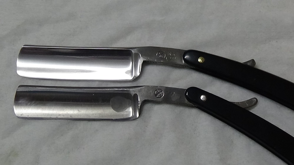 Вот 2 ГД - один за много тыщ, другой за 300руб - кроме полировки я разницы не вижу, ни внешне, ни в заточке. Претензия клиента на бритье понятна - кромка щербатая - дерет. НО! Тест на волос проходит уверенно - это к вопросу о использовании только одного теста в контроле чего-нибудь. Предыдущий заточник либо на арках точил либо с пастой переборщил, как итог - сколы. К секасу с ГД я был готов, так что переточил аккуратно на синтетике, затем япнат 4 от Гилмора (на фото узкий), который пока не пойму нравится мне или нет, затем твердый япнат на финише, ремень и готово. Вылезли откуда-то паразитные риски, но зеркальность повысилась и тест на волос намного уверенней, нежели после нетвердого япната, но нужно в бритье ещё сравнить. Эту заточку оценит другой человек.