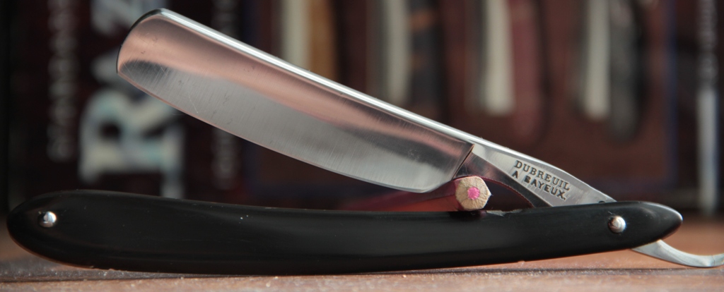 Бритва имеет толстый обушок, в связи с чем бритва несколько тяжелее своих собратьев такого размера. Из за своего веса и толстого обушка, бритва очень хорошо и легко точится без особого давления на кромку.Всё делается практически под собственным весом. Бритьё бритвой с таким полотном приближается к эталонному(ИМХО, конечно). Сталь здесь очень качественная, без каких либо проблем.Бритва совершенно непользованная.Всё оригинальное и ничего не разбиралось и не ремонтировалось. Полотно намертво впрессовано в обух. Бритва будет заточена впервые и подготовлена к бритью.