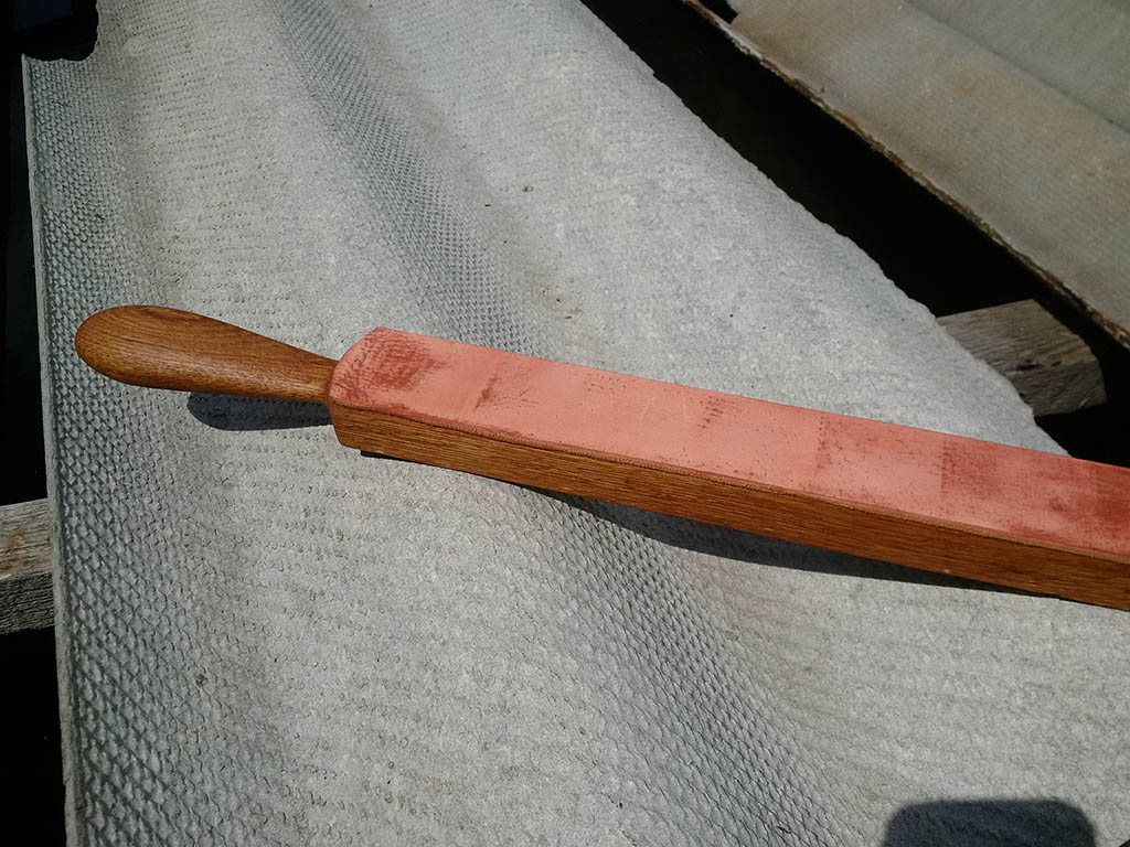 ремень Show Сначала кожу не клеил, использовал на столе. Пастой рисовал на ремне (сначала тренировался на коже без колодке, растирал тряпочкой со спиртом. По ощущениям, кожа сразу твердела. Правил старую ЗТВ51. Потом решил наклеить на деревянную колодку. Дуб из заначки 20летней сушки, твердый зараза, рубанок Sturm плакал, когда встретился с ним В итоге то, что получилось, опробовал уже на свежекупленной породистой немке. колодка с пастированной кожей Show