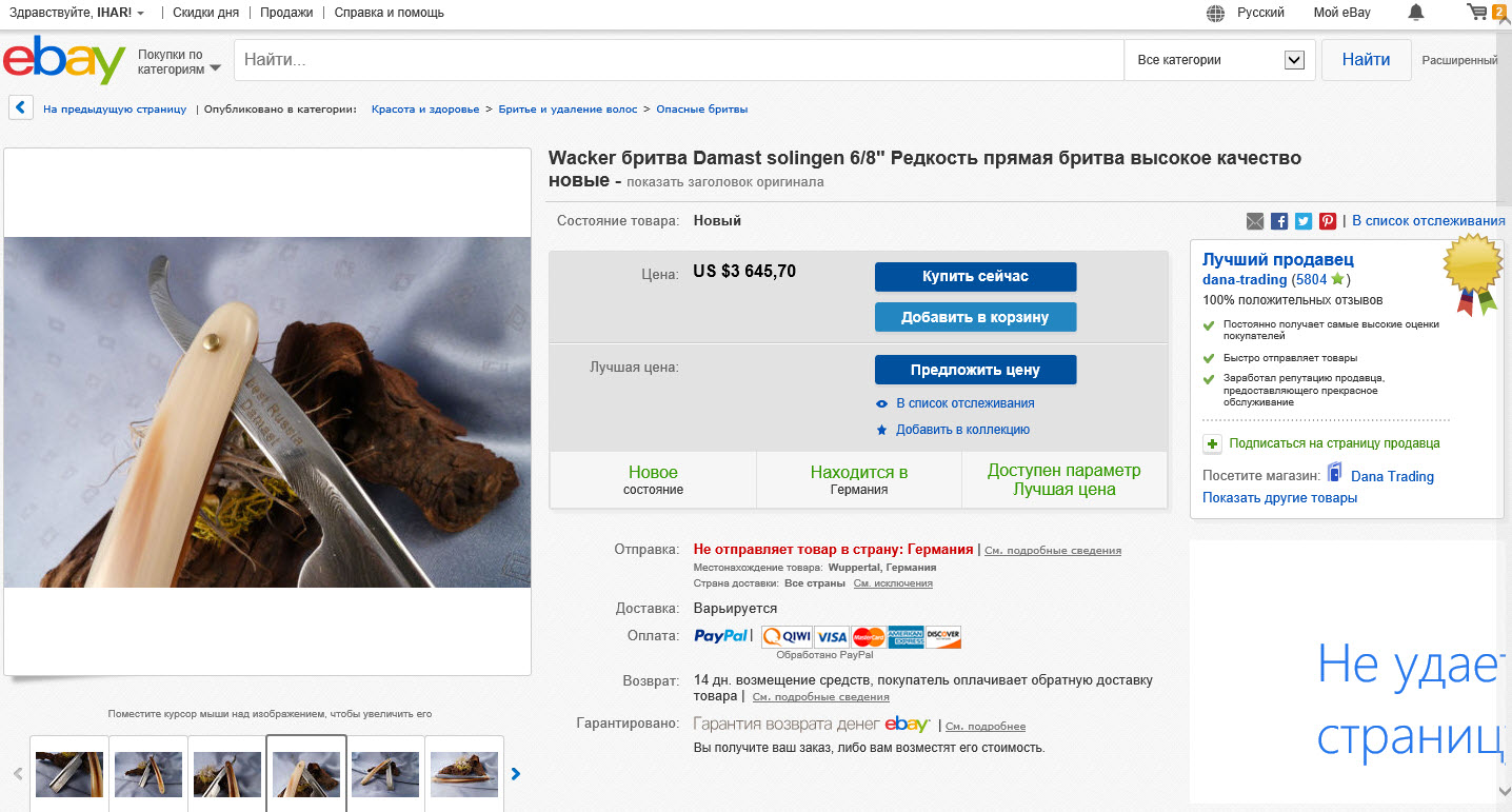 Re: Аукционы: плагиат, развод и "великолепные" описанияБритве до бритья еще тернистый путь пройти надо, ремень на правке или под замену или под пасту, но тоже после манипуляций, а цена как будто все готово к использованию. Мдя печаль.