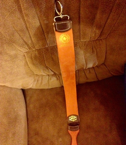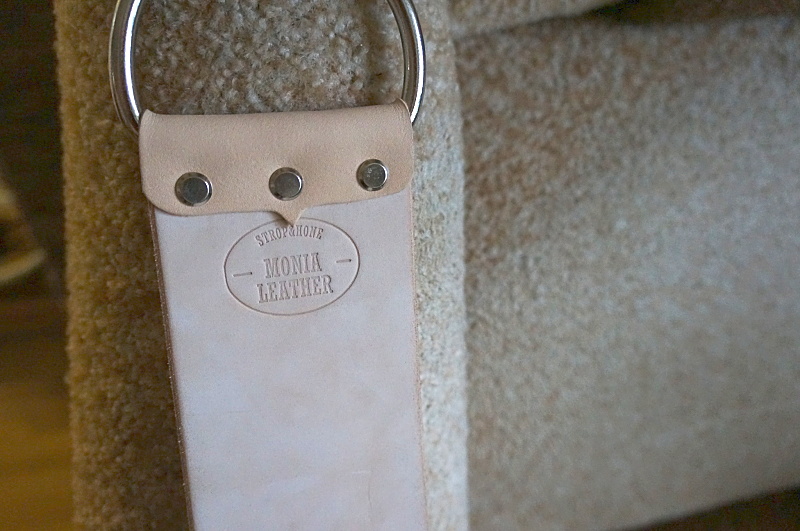 Захотелось сделать себе широкий ремень. Попросил Максима, (aka Моня), выслать кожу для бритвенного ремня. Рекламировать Моню смысла нет. Человек очень известный и уважаемый в своем деле. И. один из немногих, превосходный и очень добросовестный продавец. Испытано не раз, и не только мной  Он выслал мне ременную заготовку длиной 75, шириной 7,5 см., толшина - около 4,5 мм., а также D-кольца 2,5 дюймовые, которые хрен где найдешь и пару кусков кожи для обвязки и ручки. Ручку из кожи делать не стал, поставил полукольцо. К верхнему креплению пристегнул карабин. Сначала решил наждачкой не трогать, попробовал править - что то не устроило. Шлифанул чуток 1500 (3М) наждачкой. Заработал по другому. Короче, качество кожи превосходное, работает отлично, дешевле Канаямы в 5-7 раз  И. да, все таки на широком ремне править лучше безулыбчатую бритву. Слава богу, их есть